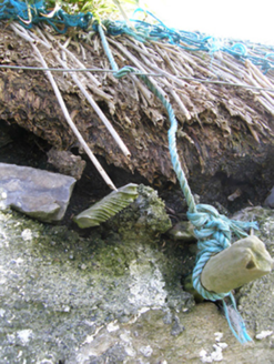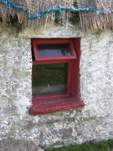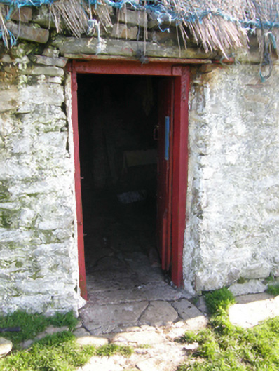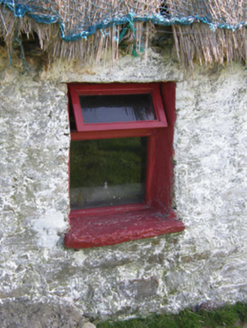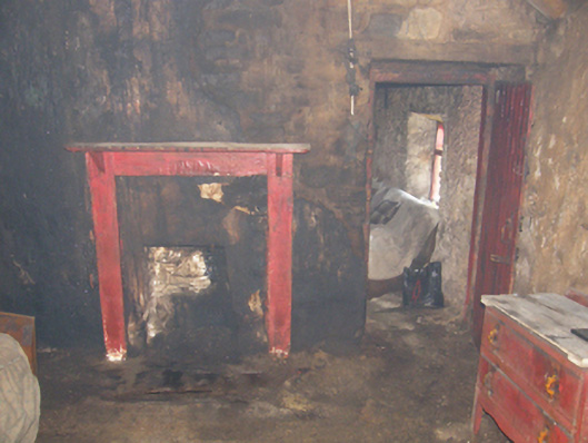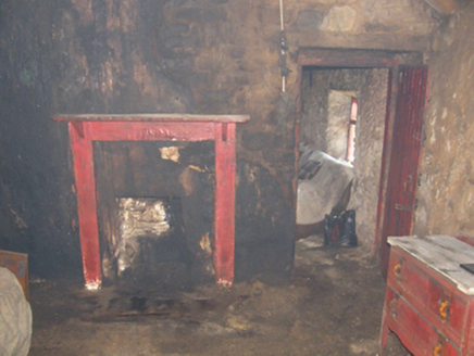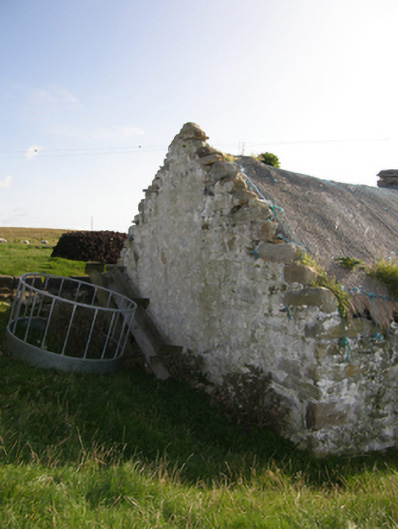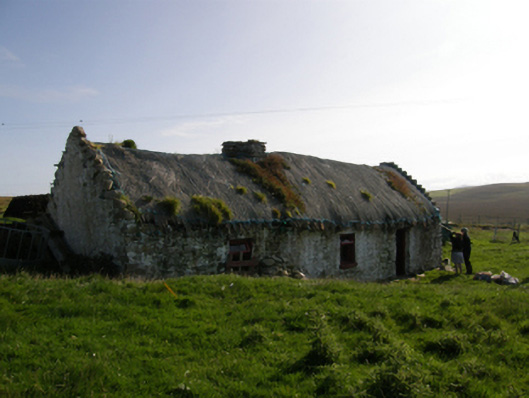 A dilapidated farmhouse identified as an important component of the vernacular heritage of Contae Mhaigh Eo [north County Mayo] by such traits as the lengthy rectilinear direct entry plan form; the construction in unrefined local fieldstone displaying a feint battered silhouette; the disproportionate bias of solid to void in the massing; and the crow stepped roof showing a grass or rush thatch finish: meanwhile, although unmarked on the first edition of the Ordnance Survey (surveyed 1838; published 1839), a discreet inscription ("1681") records the later seventeenth-century provenance of the composition.