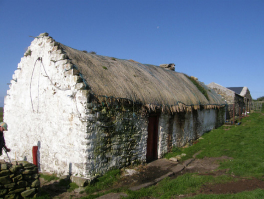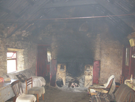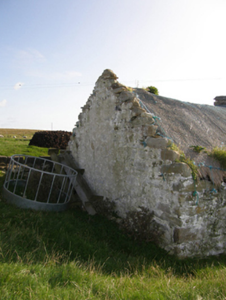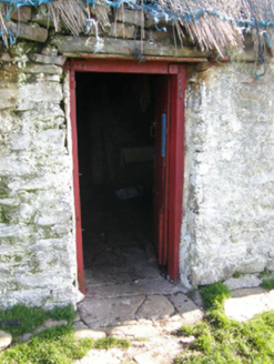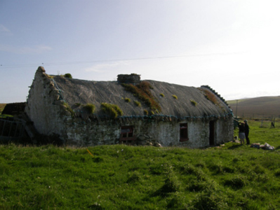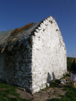 Detached three-bay single-storey direct entry thatched farmhouse, dated 1681, originally two-bay single-storey. Extended, post-1922, producing present composition. Now disused. Fishnet-covered pitched grass or rush thatch roof on collared timber construction with dry stone dwarf chimney stack, date-inscribed ("1681") limewashed rough hewn rubble stone crow stepped coping to gables, and exposed wire stretchers to eaves tied on timber pegs. Limewashed battered walls. Square-headed window openings with rough hewn rubble stone sills, and limewashed rough hewn rubble stone lintels framing timber casement windows. Square-headed opposing door openings with rough hewn rubble stone lintels framing timber boarded doors. Interior including kitchen retaining hearth. Set in own grounds on a slightly elevated site.