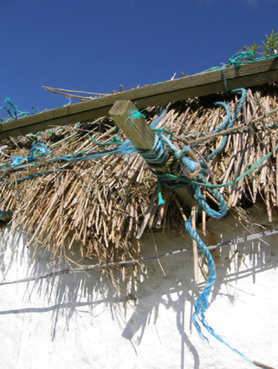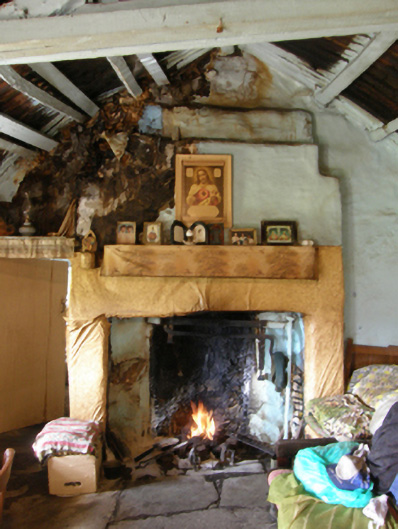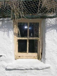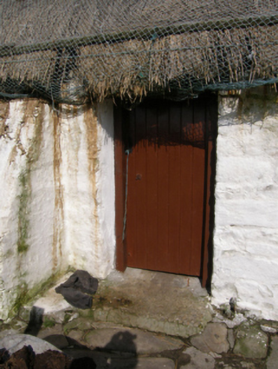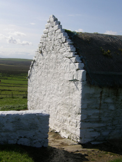 A farmhouse identified as an important component of the nineteenth-century vernacular heritage of Contae Mhaigh Eo [north County Mayo] by such attributes as the rectilinear direct entry plan form; the construction in unrefined local fieldstone not only displaying a feint battered silhouette, but also a stabilising buttress; the disproportionate bias of solid to void in the massing; and the crow stepped roof showing a replenished thatch finish.