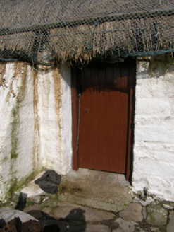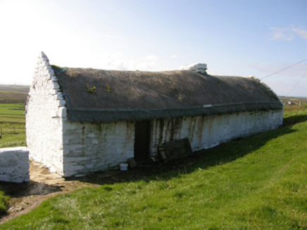 Detached three-bay single-storey direct entry thatched farmhouse, extant 1916. Fishnet-covered pitched reed thatch roof on bog deal-scraw base on collared driftwood construction with limewashed dwarf chimney stack, limewashed rough hewn rubble stone crow stepped coping to gables, and exposed twine stretchers to eaves tied on timber pegs. Limewashed battered walls with limewashed buttress to front (south-east) elevation. Square-headed window openings with limewashed rough hewn rubble stone sills, and concealed dressings framing two-over-two timber sash windows having part exposed sash boxes. Square-headed opposing door openings with rough hewn timber beam lintels framing timber boarded doors. Interior including kitchen retaining hearth. Set in own grounds on a slightly elevated site.