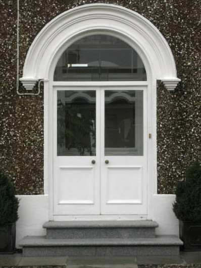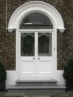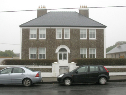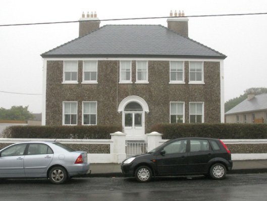 Detached three-bay two-storey house, post-1922, on a symmetrical plan. Renovated. Replacement hipped artificial slate roof with ridge tiles, gritdashed roughcast chimney stacks on axis with ridge having corbelled stepped stringcourses below stepped capping supporting ribbed terracotta pots, and uPVC rainwater goods on eaves boards on box eaves. Gritdashed roughcast walls on rendered plinth with rendered strips to corners supporting rendered band to eaves. Segmental-headed central open internal porch with two replacement steps, and concealed dressings with hood moulding over on corbelled label stops framing glazed timber panelled double doors having overlight. Square-headed door opening into house with glazed timber panelled double doors having sidelights on panelled risers below overlight. Paired square-headed window openings to front (south) elevation with square-headed window openings to rear (north) elevation centred on segmental-headed window opening (half-landing), concrete sills, and concealed dressings framing replacement two-over-two timber sash windows to front (south) elevation with two-over-two timber sash windows to rear (north) elevation centred on one-over-one timber sash window having stained glass margins. Set back from street in landscaped grounds with rendered diagonal piers to perimeter having curvilinear domed capping supporting iron gate.