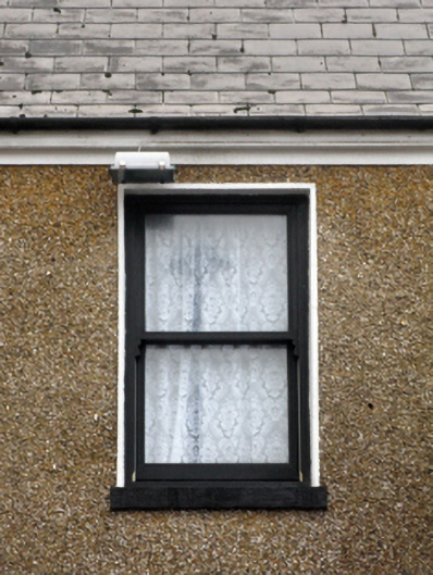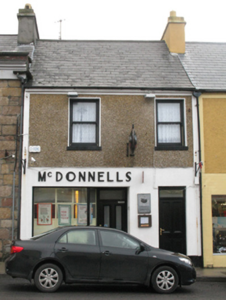 Terraced two-bay two-storey house, extant 1838[?]. Renovated, post-1942, with "shopfront" inserted to ground floor. Reroofed. Replacement pitched artificial slate roof with ridge tiles terminating in rendered chimney stack having stringcourse below capping supporting yellow terracotta tapered pots, and cast-iron rainwater goods on rendered eaves retaining cast-iron downpipe. Rendered wall (ground floor); gritdashed roughcast surface finish (first floor) with rendered strips to ends supporting rendered band to eaves. "Shopfront", post-1942, to ground floor. Square-headed window openings (first floor) with concrete sills[?], and concealed dressings framing one-over-one timber sash windows having part exposed sash boxes. Street fronted with concrete footpath to front.
