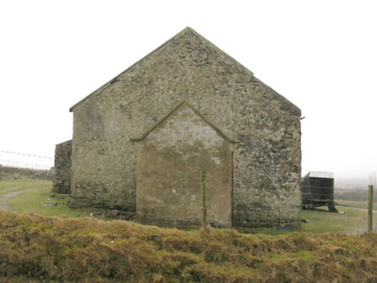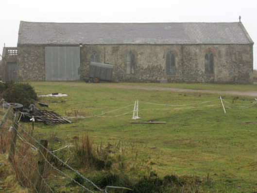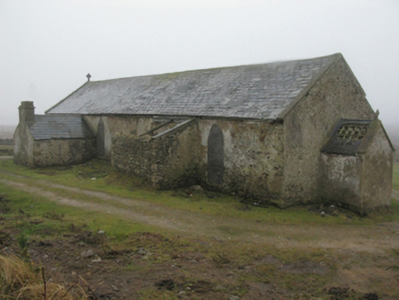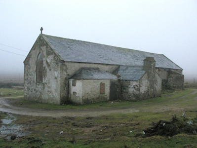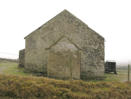 Detached five-bay double-height single-cell Catholic church, begun 1845; completed 1853, on a rectangular plan with single-bay single-storey gabled projecting porch to entrance (west) front. Now disused. Part tar-covered pitched slate roof on collared timber construction with clay ridge tiles, coping to gables including coping to gable (east) with Celtic Cross finial to apex, and no rainwater goods surviving on rendered eaves retaining cast-iron downpipes; pitched (gabled) roof (porch) with remains of slate, roll moulded clay ridge tiles, coping to gables on "Cavetto" kneelers with Celtic Cross finial to apex, and no rainwater goods on timber eaves boards retaining cast-iron downpipe. Rendered battered walls with concealed rough hewn rubble stone flush quoins to corners; rendered surface finish (porch). Pointed-arch window openings with rendered chamfered sills, timber Y-mullions, and concealed red brick voussoirs framing iron mesh storm panels over fixed-pane fittings having stained glass margins centred on leaded stained glass panels. Pointed-arch window opening (east) with rendered chamfered sill, and concealed red brick voussoirs with fitting now boarded-up. Set in unkempt grounds on a slightly elevated site with rendered concrete block piers to perimeter supporting tubular steel "farm gate".