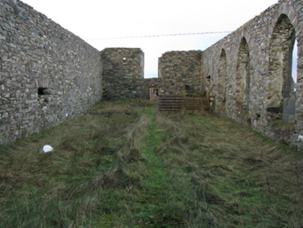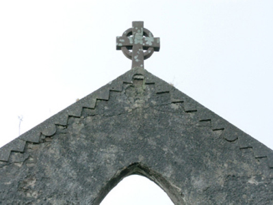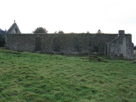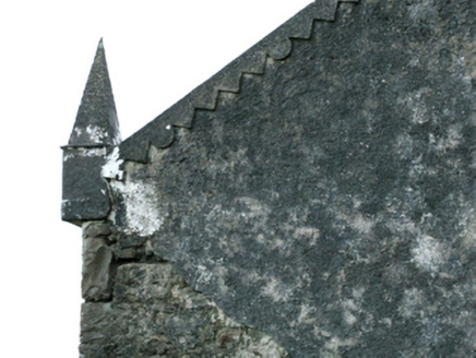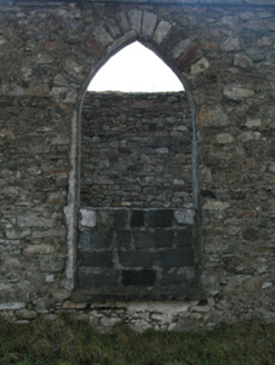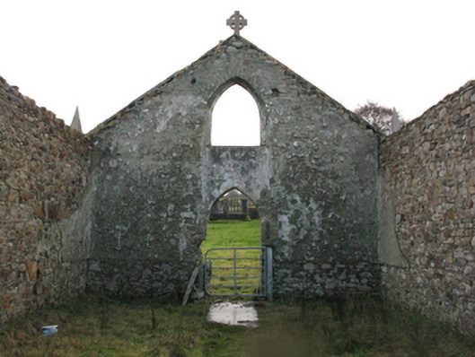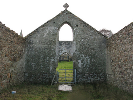 Detached four-bay double-height single-cell Catholic church, built 1832, extant 1838, originally with single-bay single-storey gabled projecting porch to entrance (south-west) front. In use, 1943. Closed, 1961. Now in ruins. Pitched roof now missing, chevron- or saw tooth-detailed rendered coping to gable to entrance (south-west) front on obelisk-pinnacled kneelers with lichen-covered cut-granite[?] Celtic Cross finial to apex, and no rainwater goods surviving on squared limestone eaves. Coursed rubble limestone walls retaining fragments of fine roughcast surface finish. Pointed-arch window openings with cut-limestone sills[?], and concealed squared limestone voussoirs framing part concrete block infill. Pointed-arch door opening to entrance (south-west) front. Pointed-arch window opening to gable with cut-limestone sill[?], and concealed dressings with no fittings surviving. Interior in ruins including overgrown stepped dais to sanctuary (north-east) with stepped "predella". Set in unkempt grounds.