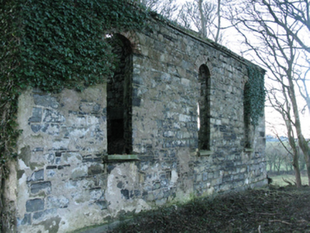 Detached three-bay double-height single-cell Presbyterian church, built 1848-50; opened 1850, with single-bay single-storey gabled projecting porch to entrance (north) front. Burnt, 1864. Reopened, 1865. In use, 1943. Closed, 1959. Now in ruins. Pitched roofs now missing, cut-limestone coping to gables including creeper- or ivy-covered cut-limestone coping to gable (south) with overgrown bellcote or chimney stack to apex[?], and no rainwater goods surviving on red brick header bond stepped eaves. Part creeper- or ivy-covered coursed or snecked limestone battered walls on limestone ashlar chamfered plinth retaining sections of fine roughcast or lime rendered surface finish. Round-headed window openings with cut-limestone sills, and creeper- or ivy-covered red brick voussoirs with no fittings surviving. Bisected round-headed door opening to entrance (north) front with step threshold now missing, and red brick voussoirs with no fittings surviving. Interior in ruins. Set in unkempt grounds.