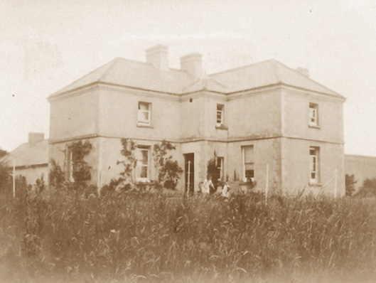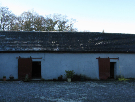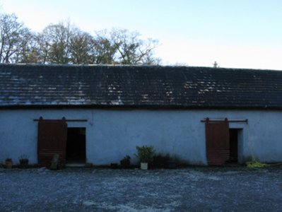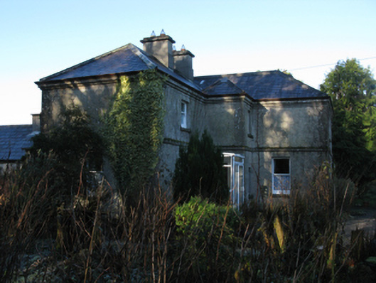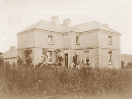 Detached three-bay two-storey farmhouse, built 1900[?]; occupied 1901, on an F-shaped plan centred on single-bay full-height breakfront on a square plan abutting single-bay (two-bay deep) two-storey projecting end bay. Hipped slate roof on an L-shaped plan centred on pyramidal slate roof with lead-covered roll moulded clay ridge tiles, paired rendered central chimney stacks on chamfered bases having stepped capping supporting terracotta pots, and cast-iron rainwater goods on tooled cut-limestone "Cavetto" cornice retaining cast-iron octagonal or ogee hoppers and downpipes. Part creeper- or ivy-covered fine roughcast walls on rendered chamfered plinth with tooled cut-limestone quoins to corners. Square-headed central door opening with concealed dressings framing timber panelled door. Square-headed window openings with drag edged dragged cut-limestone sills, and concealed red brick block-and-start surrounds framing one-over-one timber sash windows. Interior including (ground floor): entrance hall retaining carved timber surrounds to door openings framing timber panelled doors; and carved timber surrounds to door openings to remainder framing timber panelled doors with carved timber surrounds to window openings framing timber panelled shutters. Set in landscaped grounds with wrought iron "bird cage" piers to perimeter supporting looped flat iron double gates.