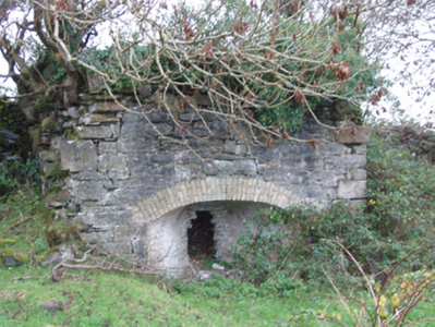 Freestanding single-oven single-stage lime kiln, extant 1896, on a square plan. Now disused. Part creeper- or ivy-covered coursed rubble limestone walls with overgrown coping to parapet. Single camber- or segmental-headed oven with yellow brick voussoirs. Set in unkempt grounds shared with Ballybroony House.