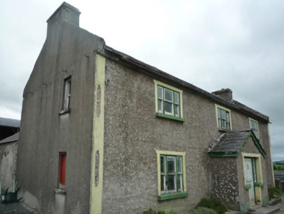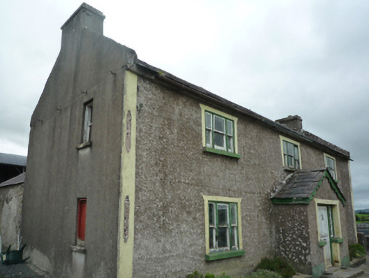 Detached three-bay two-storey farmhouse, extant 1838, on a T-shaped plan centred on single-bay single-storey gabled projecting porch to ground floor. "Improved", pre-1896, producing present composition. Occupied, 1911. Occupied, 1995. Vacant, 2000. Now disused. Pitched slate roofs on timber construction including pitched (gabled) slate roof (porch) with remains of clay ridge tiles, rendered coping to gables with rendered chimney stacks to apexes having stepped capping supporting terracotta pots, decorative timber bargeboards to gable (porch), and remains of cast-iron rainwater goods on rendered cut-limestone eaves. Roughcast wall to front (east) elevation on rendered plinth with ceramic- or glass-encrusted gritdashed roughcast-panelled rendered strips to ends; rendered surface finish (remainder). Hipped square-headed central door opening with timber mullions on step threshold, and rendered "lugged" surround framing timber panelled door having sidelights. Square-headed window openings in tripartite arrangement with concrete sills, timber mullions, and rendered "lugged" surrounds framing one-over-one timber sash windows having one-over-one sidelights. Set in landscaped grounds.