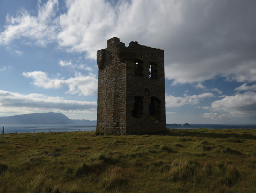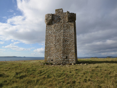 A signal tower representing an important component of the early nineteenth-century built heritage of Contae Mhaigh Eo [County Mayo] with the architectural value of the composition, one adhering to a standard prototype used for contemporary signal towers in County Cork (see 20912601) and County Donegal (see 40908001), confirmed by such attributes as the compact square plan form; the construction in unrefined local fieldstone displaying a battered silhouette; the uniform proportions of the openings on each floor; and the neo-medieval bartizans marking the roofline. NOTE: Fears of a French invasion during the Napoleonic Wars (1803-15), a realistic prospect following the successful landing by General John Joseph Amable Humbert (1767-1823) at Kilcummin Head (1798), spurred the improvement of defences along the coastline of Ireland. Glash Signal Tower was erected as one of a chain of signal towers stretching along the entire west coast from County Donegal in the north to County Cork in the south: each signal tower was built to a standard design but with some minor regional variations. The chain worked on a signalling system whereby messages – flags hoisted on masts – could be transmitted from one signal tower to its neighbour to quickly raise the alarm if an enemy fleet or vessel was in sight. However, the misty climate impeded the signal system and, the threat of invasion having abated following the Battle of Trafalgar (1805), the signal towers were quickly abandoned and allowed to fall into ruin. County Mayo once boasted eight signal towers but, following the partial collapse of Shivel Head Signal Tower during a storm (1989), only Glash Signal Tower survives largely intact.