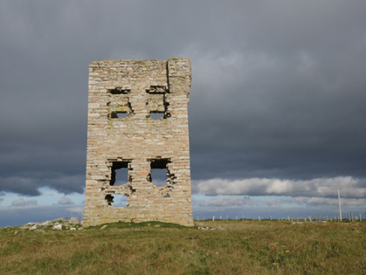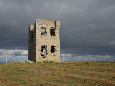 Freestanding single-bay two-stage signal tower, built 1804-6, on a square plan. In ruins, 1916. Roof now missing. Coursed rubble stone walls on battered base retaining fragments of lime rendered or roughcast surface finish with corbelled bartizans to corners centred on "wallhead" chimneystack (east). Paired square-headed window openings with dressings now missing. Interior in ruins with square-headed niches centred on square-headed fireplace. Set in unkempt grounds on an elevated site.