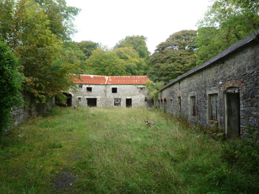 Mill complex, extant 1896, on an L-shaped plan including (east): Attached seven-bay single-storey coach house on a rectangular plan. Now disused. Pitched slate roof on collared timber construction with clay ridge tiles, and no rainwater goods surviving on cut-limestone eaves. Part creeper- or ivy-covered coursed rubble limestone walls. Series of three camber- or segmental-headed carriageways (north) with red brick voussoirs. Set in unkempt grounds shared with Owenmore.