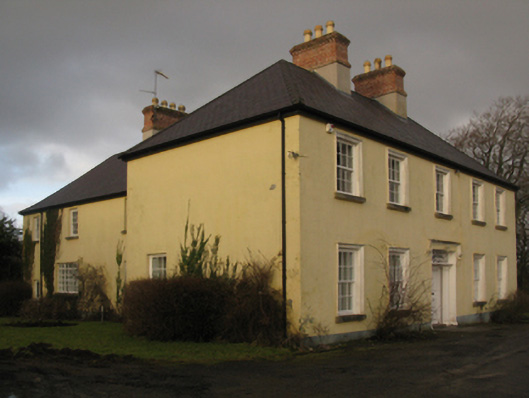 Detached five-bay two-storey country house, extant 1776, on a T-shaped plan; single-bay (four-bay deep) full-height central return (west). Occupied, 1901; 1911. Sold, 1963, to accommodate alternative use. Reroofed, 1998. Undergoing restoration, 2009. Vacated, 2011. For sale, 2012. Replacement hipped slate roof on a T-shaped plan centred on hipped slate roof (west), clay ridge tiles, paired red brick Common bond central chimney stacks on red brick header bond chamfered cushion courses on rendered bases having chevron- or saw tooth-detailed capping supporting yellow terracotta octagonal pots, and uPVC rainwater goods on timber eaves boards on rendered cut-limestone eaves retaining some cast-iron octagonal or ogee hoppers and downpipes. Part creeper- or ivy-covered rendered, ruled and lined walls. Square-headed central door opening remodelled, 1824, with limestone flagged threshold, doorcase with fluted Doric columns on padstones supporting shallow cornice, and concealed dressings with hood moulding framing timber panelled double doors having fanlight. Square-headed window openings with drag edged dragged cut-limestone sills, and moulded rendered surrounds framing six-over-six timber sash windows without horns having part exposed sash boxes. Square-headed window openings (west) with cut-limestone sills, and concealed dressings framing six-over-six timber sash windows without horns having part exposed sash boxes. Interior including (ground floor): central vestibule with decorative plasterwork cornice to ceiling; camber-headed door opening into hall with carved timber classical-style surround supporting fanlight; hall retaining carved timber surrounds to door openings framing timber panelled doors, moulded plasterwork cornice to ceiling, staircase on a dog leg plan with "spindle" balusters supporting carved timber banister terminating in turned timber newel, carved timber Classical-style surround to window opening to half-landing framing timber panelled shutters, carved timber surrounds to door openings to landing framing timber panelled doors, and moulded plasterwork cornice to ceiling centred on "Acanthus"-detailed ceiling rose; drawing room (south) retaining carved timber surround to door opening framing timber panelled door with carved timber surrounds to window openings framing timber panelled shutters, cut-white marble Classical-style chimneypiece, and decorative plasterwork cornice to ceiling centred on "Acanthus"-detailed ceiling rose; dining room (north) retaining carved timber surround to door opening framing timber panelled door with carved timber surrounds to window openings framing timber panelled shutters, cut-black marble Classical-style chimneypiece with cast-iron stove, and picture railing below decorative plasterwork cornice to ceiling; (first floor): carved timber surrounds to door openings framing timber panelled doors with carved timber surrounds to window openings framing timber panelled shutters. Set in landscaped grounds.