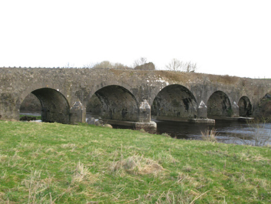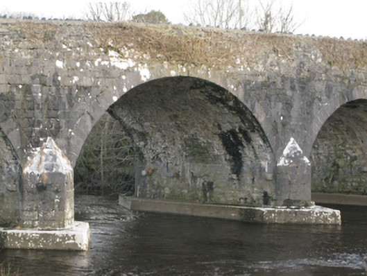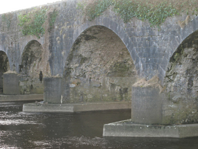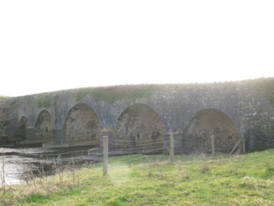 Five-arch road bridge over river, extant 1838. Part creeper- or ivy-covered walls centred on tooled limestone ashlar triangular cutwaters to piers to upriver (south) elevation on mass-concrete battered bases having lichen-covered pyramidal capping with stone-encrusted rendered rounded coping to parapets. Series of five segmental arches with drag edged tooled limestone ashlar voussoirs. Set in unkempt grounds shared with Castle Gore spanning Deel River with grass banks to river.