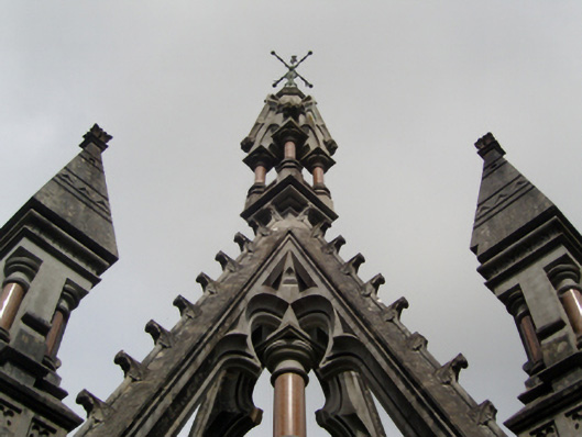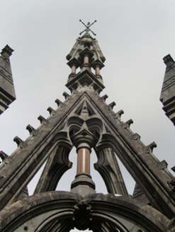 An eye-catching funerary monument erected to a design attributed to James Franklin Fuller (1835-1924) of Great Brunswick Street [Pearse Street], Dublin (Williams 1994, 301), "after" the Crown Spire of Saint Giles's Cathedral (1495; rebuilt 1648) in Edinburgh (Craig and Garner 1976, 33).