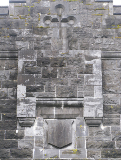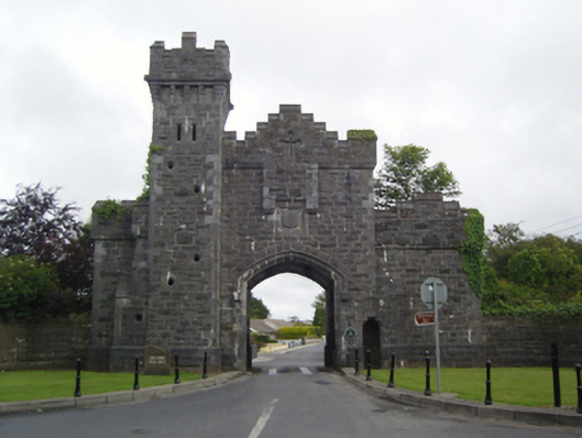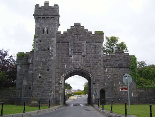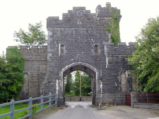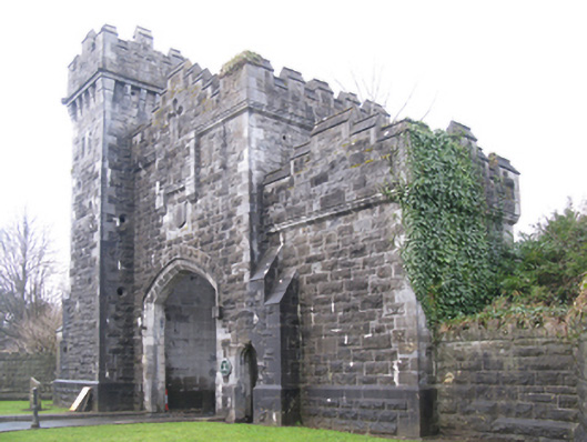 Detached three-bay single- and two-storey gate house, designed 1872, on a shallow cruciform plan centred on single-bay two-storey breakfront abutting single-bay three-stage turret (south) on a square plan. Vacated, 1959. Now in ruins. Pyramidal roofs behind parapets now missing. Part creeper- or ivy-covered tuck pointed snecked rock faced limestone walls on dragged cut-limestone chamfered cushion course on plinth with drag edged dragged cut-limestone flush quoins to corners supporting crow stepped parapets including drag edged dragged cut-limestone flush quoins to corners (breakfront) supporting "Balistraria"-detailed crow stepped parapet on thumbnail beaded stringcourse having dragged cut-limestone roll moulded coping. Pointed segmental-headed central carriageway below cut-limestone shield panel in drag edged dragged cut-limestone chamfered frame, drag edged dragged cut-limestone block-and-start surround having chamfered reveals with hood mouldings on monolithic label stops. Shouldered square-headed opposing door openings with drag edged dragged cut-limestone block-and-start surrounds having chamfered reveals framing rendered infill. Square-headed "arrow loop" window openings (first floor) with drag edged dragged cut-limestone block-and-start surrounds having chamfered reveals. Lancet window openings including some paired lancet window openings with drag edged dragged cut-limestone block-and-start surrounds having chamfered reveals framing concrete block infill. Interior in ruins. Set back from line of road at entrance to grounds of Belleek Manor.