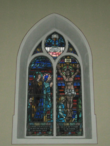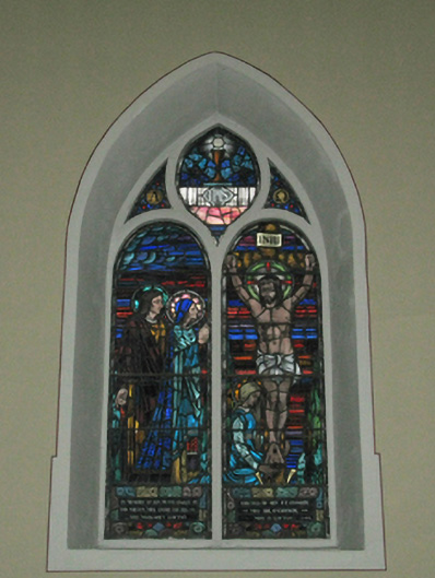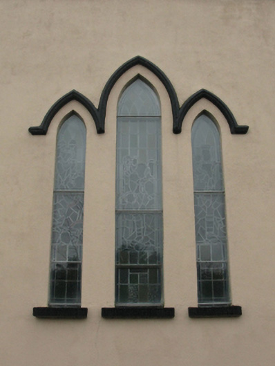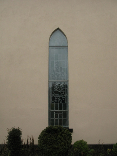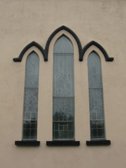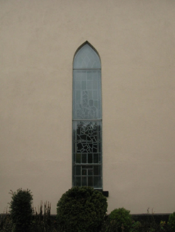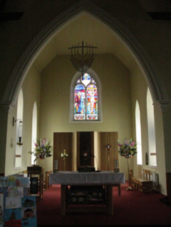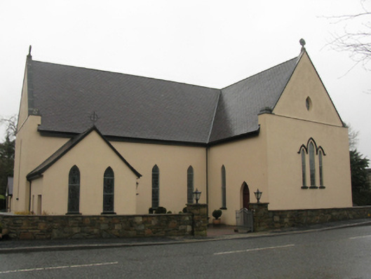 Detached six-bay double-height Catholic church, reconstructed 1908/23, on a cruciform plan comprising three-bay double-height nave opening into single-bay (single-bay deep) double-height transepts centred on two-bay double-height chancel to crossing (east). "Restored", 1942. Renovated, ----, with sanctuary reordered. Pitched slate roof on a cruciform plan with clay ridge tiles, dragged cut-limestone coping to gables on "slated" kneelers with Cross finials to apexes, and replacement uPVC rainwater goods on eaves boards on rendered eaves retaining cast-iron downpipes. Replacement cement rendered walls. Lancet window openings with cut-limestone sills, and concealed dressings framing storm glazing over fixed-pane fittings having stained glass margins centred on leaded stained glass panels. Lancet "Trinity Windows" to transepts with cut-limestone sills, and concealed dressings with hood mouldings over framing storm glazing over fixed-pane fittings having stained glass margins centred on leaded stained glass panels. Pointed-arch window opening to chancel (east) with timber Y-mullion, and concealed dressings framing storm glazing over fixed-pane fittings having stained glass margins centred on leaded stained glass panels. Lancet window opening to entrance (west) front with cut-limestone sill, and concealed dressings framing storm glazing over fixed-pane fitting having stained glass margins centred on leaded stained glass panel. Pointed-arch door openings to transepts with concealed dressings framing timber boarded or tongue-and-groove timber panelled double doors having overpanels. Full-height interior open into roof with carpeted central aisle between timber pews, Gothic-style timber memorial stations between stained glass windows (1995) with timber panelled confessional boxes to transepts below stained glass "Trinity Windows" (????), exposed strutted collared timber roof construction on cut-limestone corbels with wind braced ceiling on carved timber cornice, and pointed-arch chancel arch framing carpeted stepped dais to sanctuary (east) reordered, ----, with timber altar table below stained glass memorial "East Window" (ob. 1943). Set in landscaped grounds.