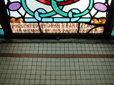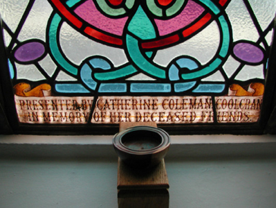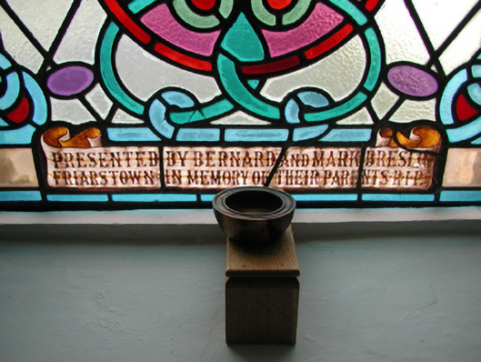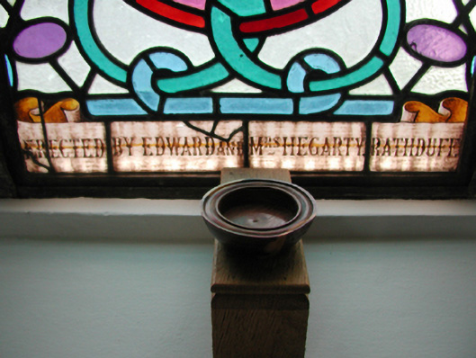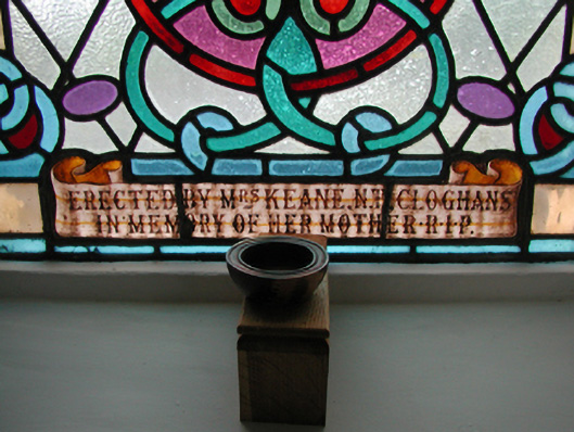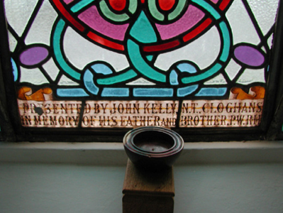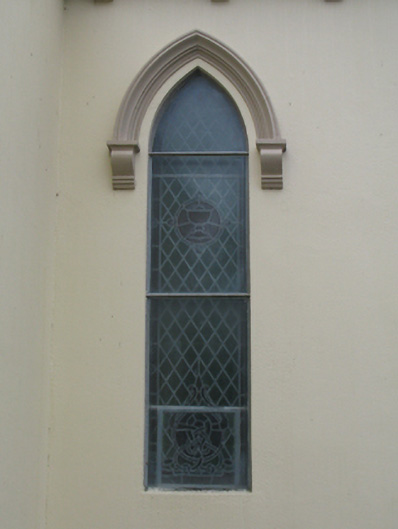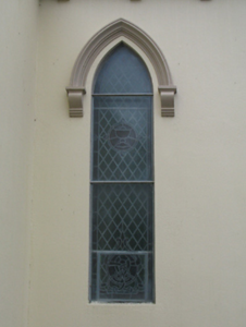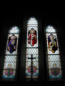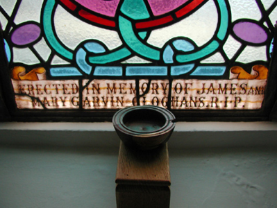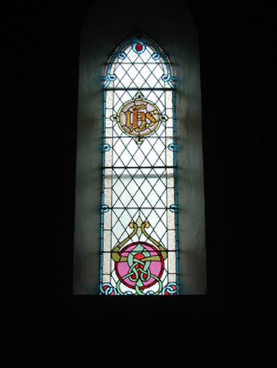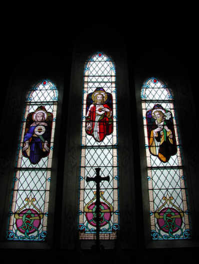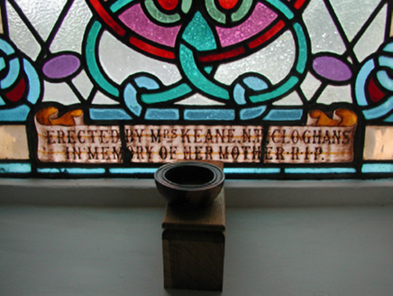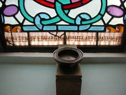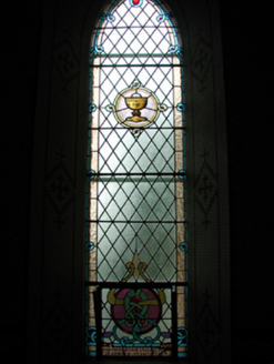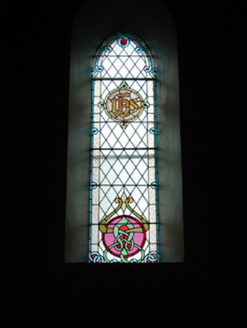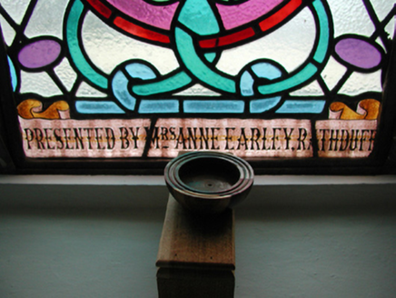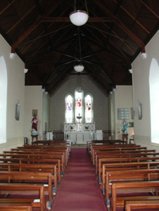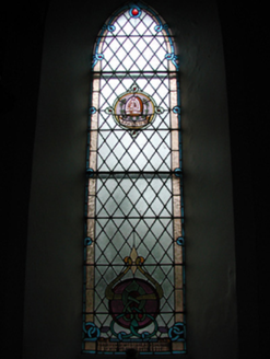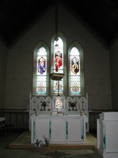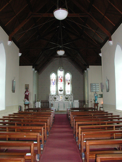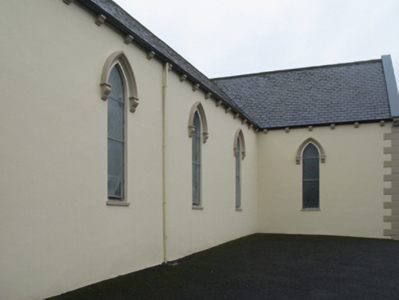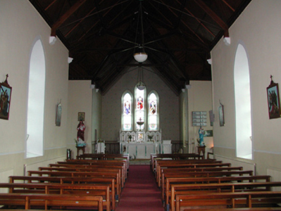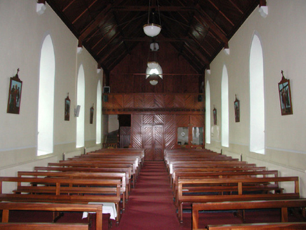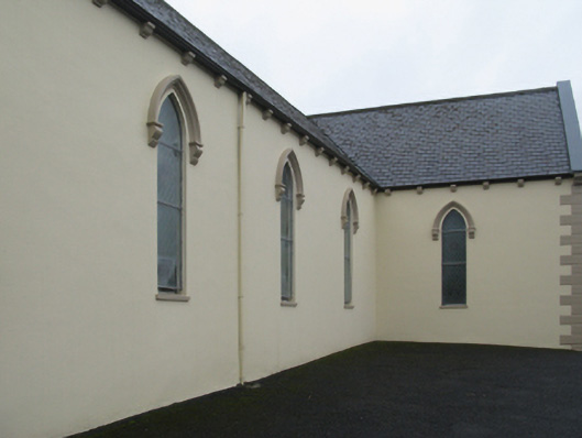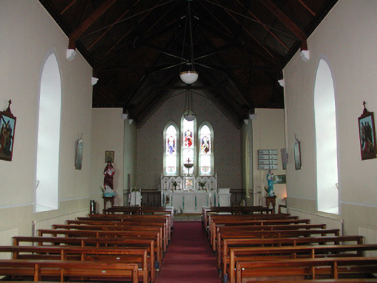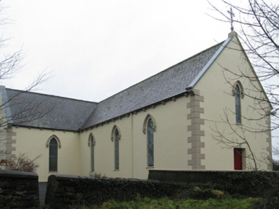 Detached five-bay double-height Catholic church, built 1842, on a cruciform plan comprising three-bay double-height nave opening into single-bay (single-bay deep) double-height transepts centred on single-bay double-height chancel to crossing (east). Renovated, 1916, with interior "improved". Renovated, ----, with sanctuary reordered. Pitched slate roof on a cruciform plan with roll moulded clay ridge tiles, iron-covered concrete coping to gables on "Cavetto" kneelers including iron-covered concrete coping to gable to entrance (west) front on "Cavetto" kneelers with wrought iron Cross finial to apex, and replacement uPVC rainwater goods on rendered eaves on "Cyma Recta" or "Cyma Reversa" consoles. Rendered walls with rusticated rendered quoins to corners. Lancet window openings with concrete sills, and concealed dressings with hood mouldings on console label stops framing storm glazing over fixed-pane fittings having stained glass margins centred on leaded stained glass roundels. Lancet "Trinity Window" (east), concealed dressings with hood mouldings on console label stops framing storm glazing over fixed-pane fittings having stained glass margins centred on leaded stained glass panels. Square-headed door opening to entrance (west) front with concealed dressings framing timber boarded or tongue-and-groove timber panelled double doors. Lancet window opening (gable) with concrete sill, and concealed dressings with hood moulding on console label stops framing storm glazing over fixed-pane fittings having stained glass margins centred on leaded stained glass roundel. Interior including vestibule (west); square-headed door opening into nave with diagonal timber boarded or tongue-and-groove timber panelled double doors; full-height interior open into roof with diagonal timber boarded or tongue-and-groove timber panelled choir gallery (west), carpeted central aisle between timber pews, timber stations between memorial windows (----), mosaic tiled stepped dais to sanctuary to crossing (east) reordered, ----, with carpeted stepped "predella" supporting replacement Gothic-style altar fittings (2004; installed 2006) below stained glass memorial "Trinity Window" (----) in mosaic tiled surround, and exposed strutted collared timber roof construction on "Cyma Recta" or "Cyma Reversa" corbels with wind braced diagonal timber boarded or tongue-and-groove timber panelled ceiling in carved timber frame on perforated frieze. Set in landscaped grounds on a slightly elevated site.