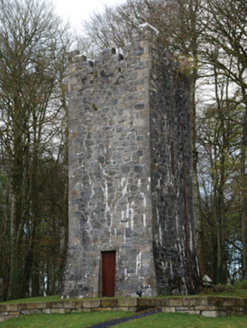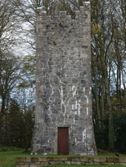 A folly-like "faux" Irish tower house water tower contributing positively to the group and setting values of the Mount Falcon estate.