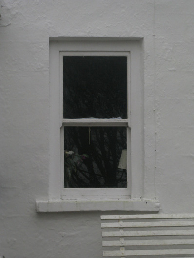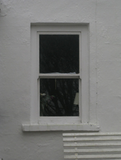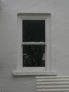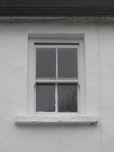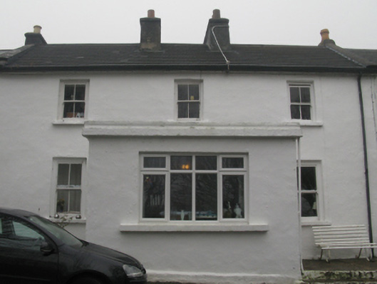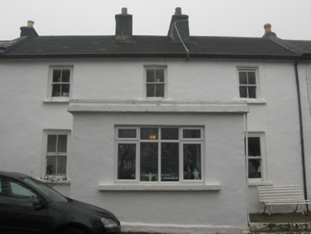 Attached three-bay two-storey house, extant 1838, on a T-shaped plan centred on single-bay single-storey flat-roofed projecting porch to ground floor. Replacement pitched fibre-cement tile roof with ridge tiles, paired rendered central chimney stacks having chamfered capping supporting terracotta or yellow terracotta tapered pots, concrete or rendered coping to gables, rooflight to rear (west) pitch, and uPVC rainwater goods on eaves boards on rendered eaves. Rendered, ruled and lined walls. Square-headed window openings with rendered sills, and concealed dressings framing two-over-two timber sash windows having exposed sash boxes. Street fronted.
