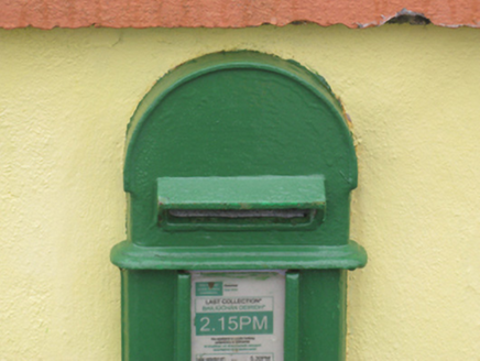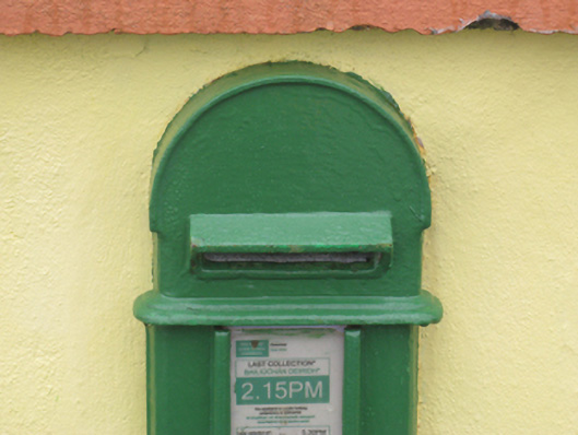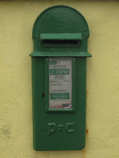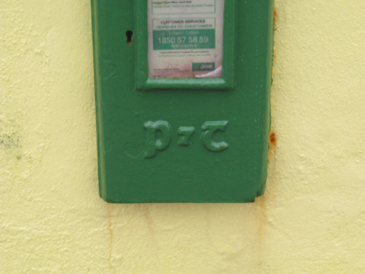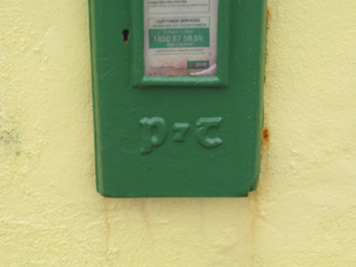 A "lamp box" post box representing an interesting example of mass-produced cast-iron work making a pleasing, if largely inconspicuous visual statement in a rural street scene with embellishments identifying the artistic potential of the composition including the Cló Gaelach or "Old Irish Lettering" defining the monogram of the Department of Posts and Telegraphs (fl. 1924-84).