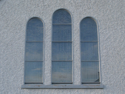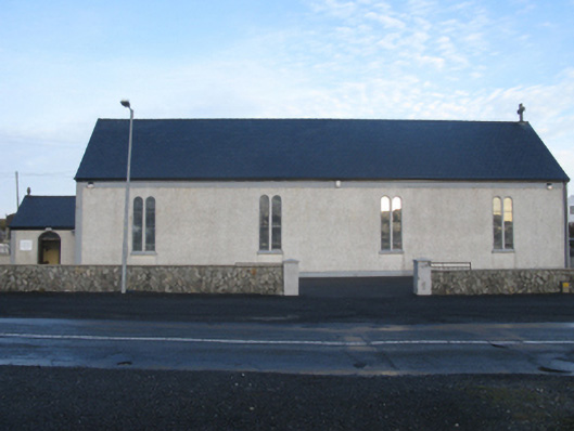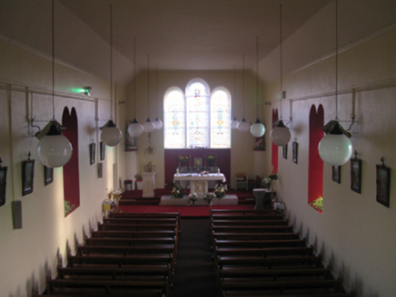 Detached four-bay double-height single-cell Catholic church, ----, on a rectangular plan with single-bay single-storey gabled projecting porch to entrance (west) front. Renovated, ----, with sanctuary reordered. Reroofed, ----. Replacement pitched slate roofs including pitched (gabled) slate roof (porch), ridge tiles with Cross finials to apexes, and uPVC rainwater goods on eaves boards on rendered eaves. Roughcast walls bellcast over rendered plinth with rendered strips to corners supporting rendered band to eaves. Round-headed window openings in bipartite arrangement with concrete sills, and concealed dressings framing storm glazing over fixed-pane fittings having stained glass margins centred on square glazing bars. Round-headed "Trinity Window" (east) with concrete sill, and concealed dressings framing storm glazing over fixed-pane fittings having stained glass margins centred on leaded stained glass panels. "Rose Window" to gable to entrance (west) front with concealed dressings framing storm glazing over fixed-pane fitting having stained glass margins centred on leaded stained glass panel. Round-headed window opening in bipartite arrangement (porch) with concrete sill, and concealed dressings framing storm glazing over fixed-pane fittings having stained glass margins centred on square glazing bars. Segmental-headed opposing door openings ("cheeks") with concealed dressings framing timber boarded double doors having overlights. Interior including vestibule (west); round-headed door opening into nave with glazed timber panelled double doors having overlight; full-height interior with choir gallery (west) below stained glass "Rose Window" (----), carpeted central aisle between timber pews, timber stations between stained glass memorial windows (----), and carpeted stepped dais to sanctuary (east) reordered, ----, with cut-veined white marble Gothic-style high altar below stained glass memorial "Trinity Window" (----). Set in own grounds.