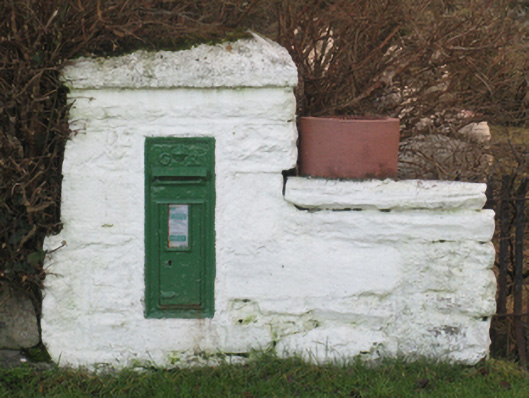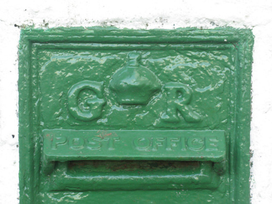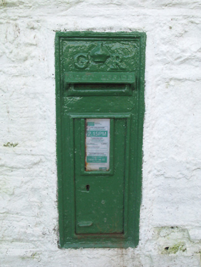 Pier-mounted cast-iron "wall box" post box, extant 1915, with "GR [Georgius Rex]" royal cipher. Set in limewashed pier.