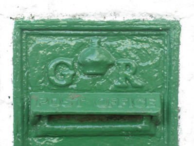 A "wall box" post box supplied by W.T. Allen and Company (fl. 1881-1955) of London representing an interesting example of mass-produced cast-iron work making a pleasing, if largely inconspicuous visual statement in a rural street scene with embellishments identifying the artistic potential of the composition including the King George V (1865-1936; r. 1910-22) royal cipher of additional significance as an imprinted reminder of the period when Ireland formed part of the British Empire.