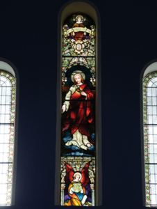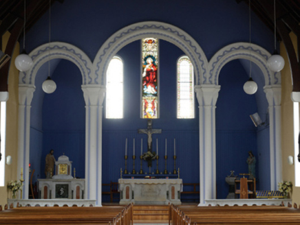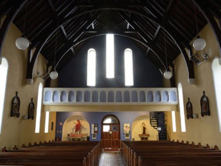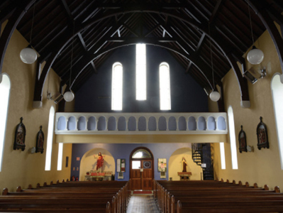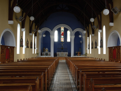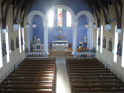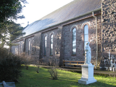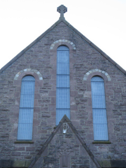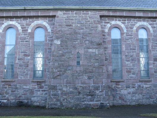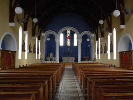 A church erected to designs (1925-30) by Ralph Henry Byrne (1877-1946) of Suffolk Street, Dublin, representing an important component of the early twentieth-century ecclesiastical heritage of Contae Mhaigh Eo [County Mayo] with the architectural value of the composition, one interpretable as a scaled-down reduction of the Rudolph Maximilian Butler (1872-1943)-designed Saint Patrick's Catholic Church (1914-9) in Newport (see 31208021), confirmed by such attributes as the rectilinear "barn" plan form; the robust rock faced surface finish offset by sheer ruby red sandstone dressings not only demonstrating good workmanship, but also providing an interplay of light and shade in an already mildly polychromatic palette; the slender profile of the coupled openings underpinning a Hiberno-Romanesque theme with the chancel lit by an elegant "Trinity Window"; and the high pitched roof. Having been well maintained, the form and massing survive intact together with substantial quantities of the original fabric, both to the exterior and to the interior where contemporary joinery; Celtic strapwork stained glass; a lofty arcade; altar fittings supplied by C.W. Harrison and Sons (formed 1889) of Great Brunswick Street [Pearse Street], Dublin; and a vibrant "South Window", all highlight the artistic potential of the composition: meanwhile, an exposed timber roof construction pinpoints the engineering or technical dexterity of a church making a pleasing visual statement in a waterside village street scene.