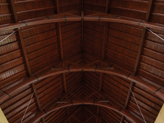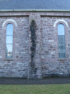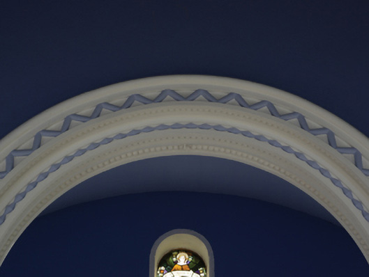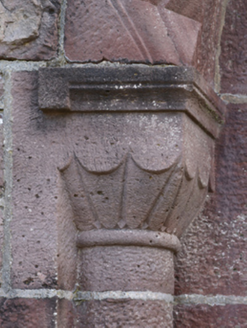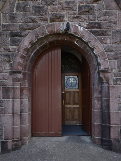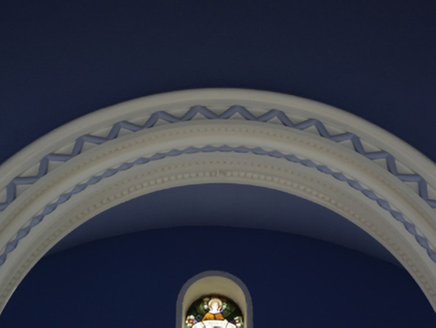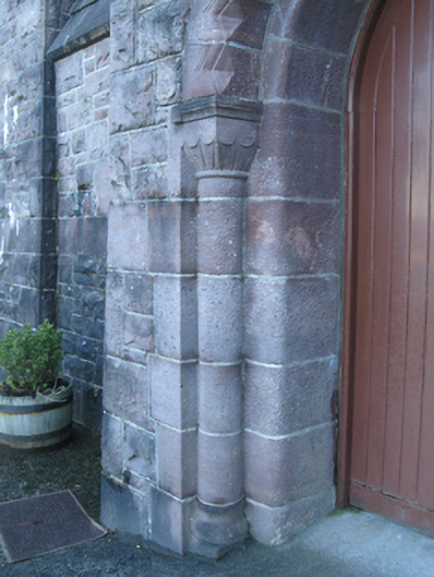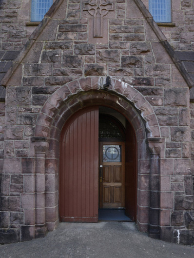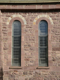 Detached five-bay double-height single-cell Catholic church, designed 1925-30; built 1928-30, on a rectangular plan; single-bay single-storey gabled projecting porch to entrance (north) front. Pitched slate roof with quatrefoil-perforated crested clay ridge tiles, lichen-covered tooled cut-sandstone coping to gables with Celtic Cross finials to apexes, and cast-iron rainwater goods on timber eaves boards on tooled cut-sandstone eaves retaining cast-iron downpipes. Tuck pointed snecked rock faced sandstone walls on tooled cut-sandstone cushion course on battered base with snecked rock faced sandstone battered piers to corners having tooled cut-sandstone "slated" coping. Paired round-headed window openings in square-headed recesses between snecked rock faced sandstone battered buttresses with cut-sandstone chamfered sills, and margined tooled hammered sandstone block-and-start surrounds framing storm glazing over fixed-pane fittings having leaded stained glass margins centred on square glazing bars. Round-headed "Trinity Window" (south) with cut-sandstone chamfered sills, and margined tooled hammered sandstone block-and-start surrounds framing storm glazing over fixed-pane fittings centred on fixed-pane fitting having leaded stained glass panel. Round-headed door opening (porch) with poured concrete threshold, and margined tooled cut-sandstone block-and-start surround having engaged colonette-detailed stepped reveals with chevron-detailed archivolt framing timber boarded double doors. Round-headed stepped "Trinity Window" (gable) with cut-sandstone chamfered sills, and margined tooled hammered sandstone block-and-start surrounds framing storm glazing over fixed-pane fittings having leaded stained glass margins centred on square glazing bars. Interior including vestibule (north); round-headed door opening into nave with glazed timber panelled double doors having overlight; full-height interior open into roof with arcaded choir gallery (north) below "Trinity Window", tiled central aisle in mosaic tiled frame between cruciform-detailed timber pews, paired Romanesque-style timber stations centred on timber panelled confessional boxes in round-headed alcoves, exposed round arch braced strutted collared timber roof construction on beaded corbels with wind braced rafters to timber boarded ceiling, and cut-veined white marble stepped dais to sanctuary (south) retaining arcaded communion railings with round-headed tripartite arcade on clustered colonettes framing cut-veined white marble Romanesque-style altar (1930) below stained glass "Trinity Window" (----). Set in landscaped grounds on a corner site with tuck pointed margined rock faced sandstone ashlar panelled piers to perimeter having tooled cut-sandstone "slated" capping.