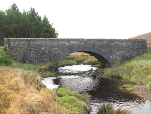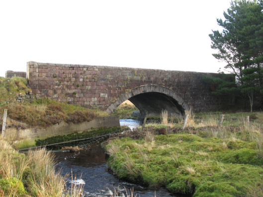 Single-arch road bridge over river, built 1829-30; extant 1838. Part tuck pointed coursed cut-sandstone walls between coursed cut-sandstone piers with hammered sandstone rounded coping to parapets. Single segmental arch with drag edged rusticated limestone ashlar voussoirs. Sited spanning An Cartún [Cartron River] with unkempt banks to river.
