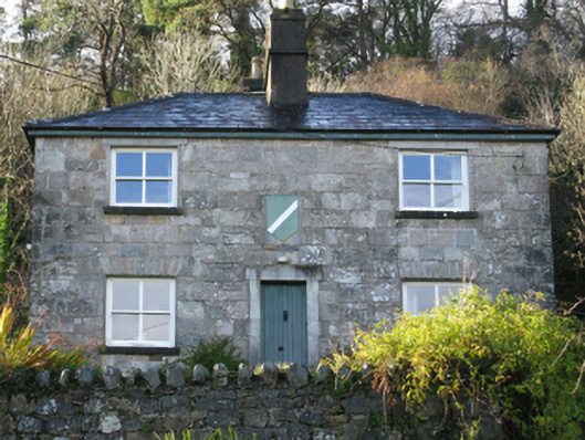 Detached three-bay two-storey police station, extant 1838, on a symmetrical plan. Occupied, 1901. Vacant, 1908. Occupied, 1911. Renovated, 2001, to accommodate continued occasional use. Hipped slate roof with clay ridge tiles, rendered central chimney stacks including rendered buttressed "wallhead" chimney stack (west) having stringcourses below stepped capping supporting yellow terracotta tapered pots, and cast-iron rainwater goods on timber eaves boards on cut-limestone eaves retaining cast-iron downpipes. Part repointed coursed or snecked rubble limestone walls with cut-limestone flush quoins to corners. Square-headed central door opening below tooled cut-limestone shield panel with drag edged tooled cut-limestone block-and-start surround framing timber boarded double doors. Square-headed window openings originally in tripartite arrangement with drag edged tooled cut-limestone sills, and tooled cut-limestone voussoirs framing replacement two-over-two timber sash windows replacing two-over-two timber sash windows having horizontal glazing bars. Set in landscaped grounds on an elevated site with boundary wall to perimeter having rubble limestone coping.