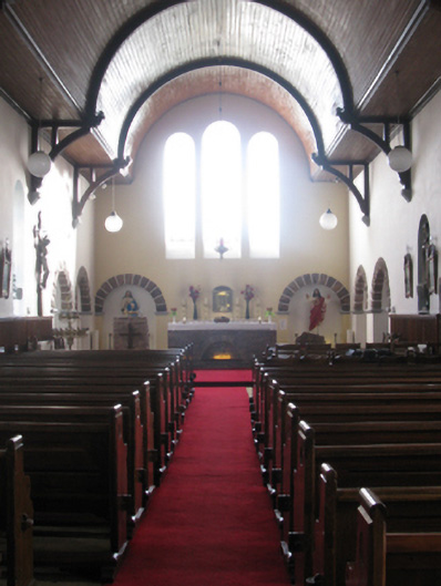 Detached eight-bay double-height single-cell Catholic church, designed 1904; built 1905-6; dedicated 1906, on a rectangular plan originally six-bay double-height single-cell. Extended, 1931, producing present composition. Renovated, ----, with sanctuary reordered. Reroofed, ----. Replacement pitched slate roof with clay or terracotta ridge tiles, "Cyma Recta"- or "Cyma Reversa"-detailed coping to gables including "Cyma Recta"- or "Cyma Reversa"-detailed coping to gable to entrance (north) front with drag edged rock faced cut-sandstone battered bellcote to apex framing cast-bronze bell, and uPVC rainwater goods on timber eaves boards on slightly overhanging exposed timber rafters retaining some cast-iron octagonal or ogee hoppers and downpipes. Roughcast battered walls on rendered chamfered plinth with drag edged rock faced hammered sandstone quoins to corners; roughcast wall to entrance (north) front with segment-topped drag edged rock faced sandstone ashlar clasping buttresses to corners. Round-headed window openings with drag edged rock faced hammered sandstone block-and-start surrounds framing fixed-pane fittings. Round-headed "Trinity Window" (south) with drag edged rock faced hammered sandstone block-and-start surround framing fixed-pane fittings. Round-headed door opening to entrance (north) front with concrete threshold, and drag edged rock faced hammered sandstone block-and-start surround having stepped rebated reveals with hood moulding framing replacement timber boarded double doors having overlight. Round-headed "Trinity Window" (gable), drag edged rock faced hammered sandstone block-and-start surround with hood moulding framing storm glazing over fixed-pane fittings having stained glass margins centred on leaded stained glass panel. Interior including vestibule (north) with encaustic tiled floor; square-headed door opening into nave with glazed timber panelled double doors having sidelights on panelled risers; full-height interior with timber panelled choir gallery (north) below stained glass "Trinity Window" (----), carpeted central aisle between roll-topped timber pews, timber panelled wainscoting supporting carved timber dado rail, paired Gothic-style timber stations, carpeted stepped dais to sanctuary (south) reordered, ----, with replacement altar below "Trinity Window", and exposed Hammerbeam roof construction on corbels with timber boarded barrel vaulted ceiling on carved timber cornice. Set in relandscaped grounds with drag edged rock faced sandstone ashlar piers to perimeter having ovoid finial-topped beach stone capping.