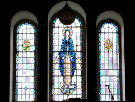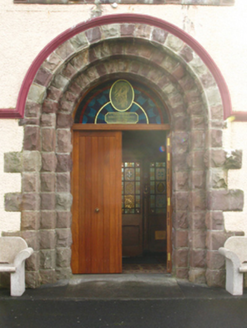 A church erected to designs (1904) by Doolin, Butler and Donnelly (formed 1902) of Dawson Street, Dublin (Irish Builder 11th February 1905, 98; 6th October 1906, 808), representing an important component of the early twentieth-century built heritage of County Mayo with the architectural value of the composition, one 'designed in the Irish Romanesque style freely treated [with] the influence of such typical Irish remains as Jerpoint and Youghal…markedly observable in its design' (The Mayo News 30th December 1905, --), confirmed by such attributes as the "barn" plan form, aligned along a skewed liturgically-correct axis; the slender profile of the openings underpinning a Hiberno Romanesque theme with the chancel defined by an elegant "Trinity Window"; and the handsome bellcote embellishing the roofline as a picturesque eye-catcher in the landscape: meanwhile, aspects of the composition clearly illustrate the continued linear development of the church to designs (1931) by Rudolph Maximilian Butler (1872-1943) of Merrion Square, Dublin (Irish Builder 1st August 1931, 686; 12th September 1931, 805). Having been well maintained, the elementary form and massing survive intact together with substantial quantities of the original fabric, both to the exterior and to the interior reordered (----) in accordance with the liturgical reforms sanctioned by the Second Ecumenical Council of the Vatican (1962-5): meanwhile, a Hammerbeam roof construction pinpoints the engineering or technical dexterity of a church forming part of a self-contained group alongside the adjacent Convent of Mercy (see 31306606) with the resulting ecclesiastical ensemble making a pleasing visual statement in a rural village street scene.