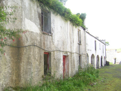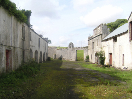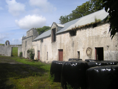 Farmyard complex, extant 1901, including (west): Attached six-bay two-storey coach house on a symmetrical plan. Now disused. Pitched slate roof on strutted King post timber construction with clay ridge tiles, lichen-covered rock faced cut-limestone battlemented crow stepped coping to gables with rendered chimney stacks to apexes having stringcourses below capping supporting yellow terracotta pots, and cast-iron rainwater goods on timber eaves boards retaining cast-iron downpipes. Limewashed roughcast walls. Series of six segmental-headed carriageways with concealed red brick voussoirs. Square-headed window openings (first floor) centred on square-headed loading opening with cut-limestone sills, and concealed dressings with no fittings surviving. Set in wooded grounds shared with Rosturk Castle.