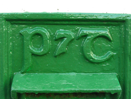 Wall-mounted cast-iron "wall box" post box, between 1939-62, with "P7T [Posts and Telegraphs]" monogram. Set in rendered wall.