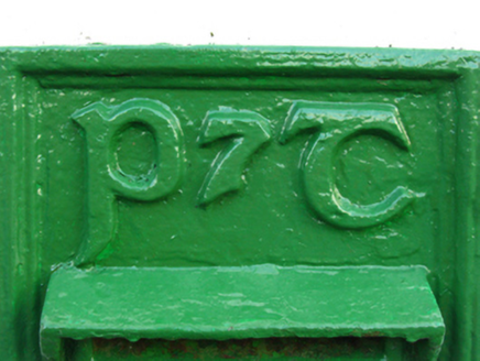 A "wall box" post box supplied by Jessop Davis (closed 1962) of Enniscorthy, County Wexford, representing an interesting example of mass-produced cast-iron work making a pleasing, if largely inconspicuous visual statement in a sylvan street scene with embellishments identifying the artistic potential of the composition including the Cló Gaelach or "Old Irish Lettering" defining the monogram of the Department of Posts and Telegraphs (fl. 1924-94).