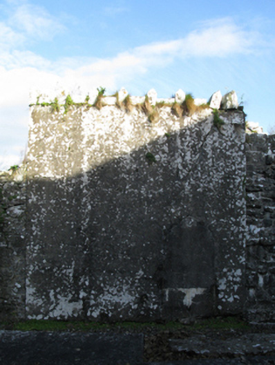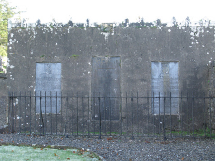 Attached single-bay single-stage mausoleum, dated 1813, on a rectangular plan. In ruins, 1944. Roof now missing. Rendered, ruled and lined walls centred on inscribed cut-limestone panel ("1813") with lichen-covered cut-limestone "pointed" battlemented parapet. Set in shared grounds with wrought iron railings to perimeter.