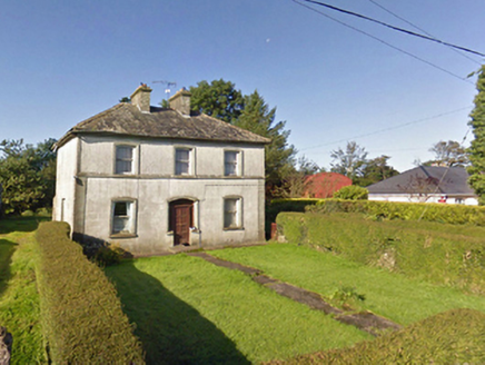 Detached three-bay two-storey farmhouse, post-1920, on a symmetrical plan. Now disused. Hipped slate roof with lichen-covered clay or terracotta ridge tiles, paired rendered central chimney stacks having corbelled stepped stringcourses below capping supporting terracotta or yellow terracotta pots, and cast-iron rainwater goods on timber eaves boards on box eaves retaining cast-iron downpipes. Rendered walls (ground floor) with rusticated rendered piers to ends supporting rendered stringcourse; fine roughcast surface finish (first floor) with rendered strips to ends supporting rendered band to eaves. Hipped camber-headed central door opening with timber mullions on concrete step threshold supporting timber transom, and moulded rendered surround framing replacement timber panelled door having sidelights below overlight. Camber-headed window openings with concrete sills, and moulded rendered surrounds framing one-over-one timber sash windows having part exposed sash boxes. Set back from road in landscaped grounds with rendered piers to perimeter having moss-covered stepped capping supporting flat iron gate.
