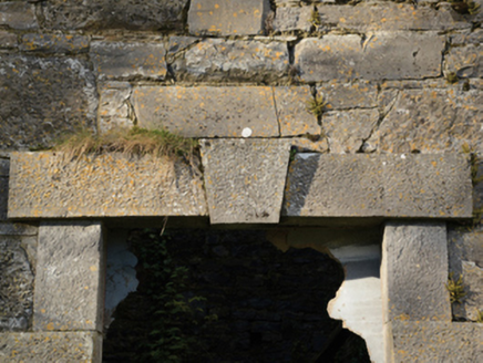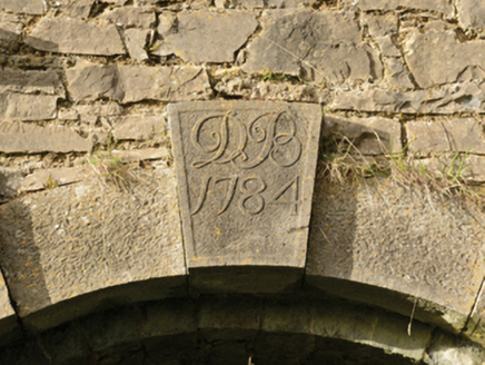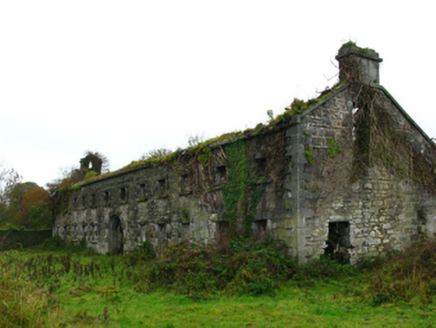 Farmyard complex, dated 1784, including: Detached eleven-bay single-storey coach house-cum-stable outbuilding with half-attic on a symmetrical plan. Now in ruins. Pitched slate roof now missing, lichen-covered dragged cut-limestone coping to gables with drag edged dragged limestone ashlar bellcote (south) or drag edged dragged limestone ashlar chimney stack (north) to apexes, and no rainwater goods surviving on dragged cut-limestone eaves. Part creeper- or ivy-covered walls originally rendered with drag edged tooled cut-limestone quoins to corners. Segmental-headed central carriageway with drag edged tooled cut-limestone block-and-start surround centred on date stone-inscribed drag edged tooled cut-limestone keystone ("1784"). Square-headed flanking door openings with drag edged tooled cut-limestone block-and-start surrounds centred on drag edged tooled cut-limestone keystones. Square-headed window openings with drag edged dragged cut-limestone sills, and drag edged tooled cut-limestone block-and-start surrounds centred on drag edged tooled cut-limestone keystones with no fittings surviving. Interior in ruins. Set in unkempt grounds shared with Raheens House.