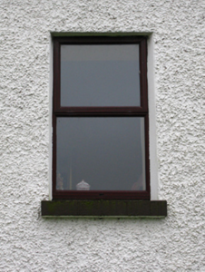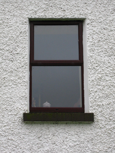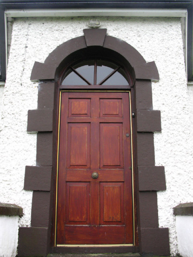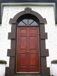 Detached five-bay single-storey over raised basement farmhouse, extant 1777, on a T-shaped plan centred on single-bay full-height breakfront on an engaged half-octagonal plan. Vacant, 1901[?]. Occupied, 1911. Extensively renovated. Replacement pitched slate roof on a T-shaped plan centred on half-octagonal slate roof with ridge tiles, abbreviated drag edged tooled cut-limestone coping to gables with drag edged tooled snecked limestone chimney stacks to apexes having stringcourses below chamfered capping supporting terracotta or yellow terracotta pots, and uPVC rainwater goods on timber eaves boards on rendered cut-limestone eaves. Roughcast walls bellcast over rendered plinth. Round-headed niches centred on round-headed central door opening approached by flight of nine benchmark-inscribed cut-limestone steps with drag edged cut-limestone block-and-start surround centred on keystone framing replacement timber panelled door having fanlight. Square-headed window openings with drag edged cut-limestone sills, and concealed dressings framing replacement casement windows replacing one-over-one timber sash windows having part exposed sash boxes. Set in landscaped grounds with rendered piers to perimeter having ivy-covered capping supporting wrought iron double gates.