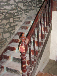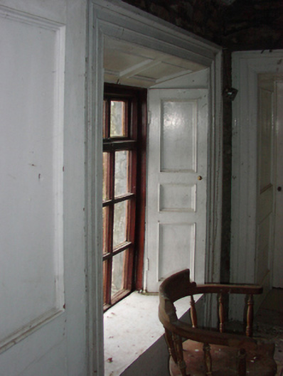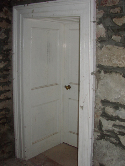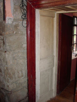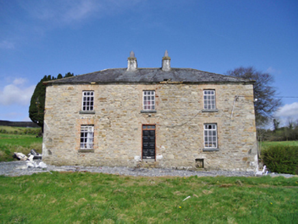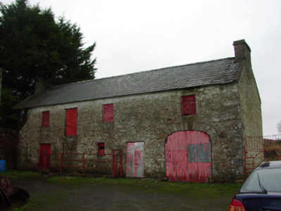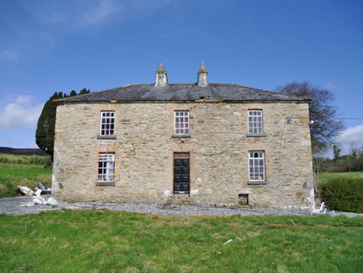 Detached three-bay two-storey over basement tenant farmhouse, extant 1838, on a T-shaped plan with single-bay (two-bay deep) two-storey lower central return (north). In occasional use, 1862. Occupied, 1911. Sold, 1931. Renovated, 1985. Resold, 1999. Vacant, 2002. Undergoing "restoration", 2009-12. Hipped slate roof on collared timber construction centred on pitched slate roof (north) with clay ridge tiles, paired rendered central chimney stacks having red brick stringcourses below capping supporting crested pots, and remains of cast-iron rainwater goods on limewashed rendered red brick header bond eaves retaining cast-iron octagonal or ogee hoppers and downpipes. Coursed rubble stone battered walls originally limewashed with squared rubble stone flush quoins to corners; remains of limewashed surface finish to side (west) elevation. Square-headed central door opening with red brick block-and-start surround framing timber panelled door having overlight. Square-headed window openings with drag edged dragged cut-limestone sills, and red brick block-and-start surrounds framing replacement timber casement windows retaining three-over-six (ground floor) or one-over-one (first floor) timber sash windows to rear (north) elevation. Interior including (ground floor): central entrance hall-cum-staircase hall retaining carved timber surrounds to door openings framing timber panelled doors, staircase on a dog leg plan with turned timber "spindle" balusters supporting carved timber banister terminating in turned timber newels, carved timber surrounds to door openings to landing framing timber panelled doors, and timber boarded vaulted ceiling; reception room (west) retaining carved timber surround to door opening framing timber panelled door with carved timber surround to window opening framing timber panelled shutters, and timber boarded ceiling; reception room (east) retaining carved timber surround to door opening framing timber panelled door with carved timber surround to window opening framing timber panelled shutters, and moulded plasterwork cornice to ceiling; kitchen (north) retaining hearth with tooled cut-limestone voussoirs; and carved timber surrounds to door openings to remainder framing timber panelled doors. Set in unkempt grounds.