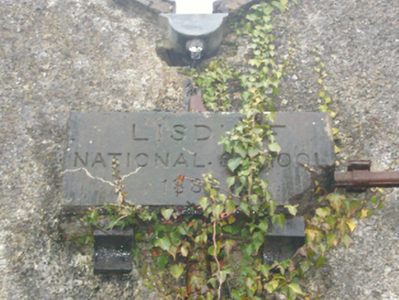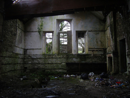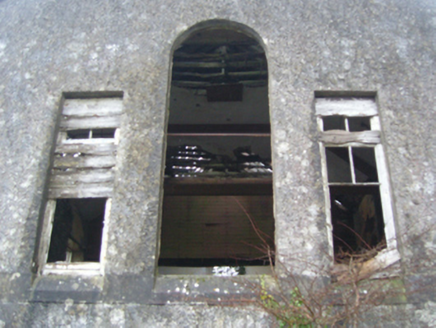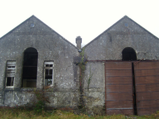 Detached two-bay (two-bay deep) double-height double gable-fronted national school, dated 1888; opened 1888; extant 1895, on a symmetrical T-shaped plan with single-bay single-storey lean-to "bas-relief" recessed porches abutting single-bay single-storey gabled recessed end bays. Extended, post-1920, producing present composition. In use, 1971. Closed, 1973. Now disused. Pitched (gable-fronted) slate roofs on collared timber construction centred on pitched double gable-fronted (M-profile) slate roofs extending into lean-to slate roofs with clay ridge tiles, rendered chimney stacks on rendered chamfered bases centred on rendered chimney stack having corbelled stepped stringcourses below lichen-covered capping supporting terracotta pots, concrete coping to gables on concrete kneelers, and no rainwater goods surviving on exposed timber rafters retaining cast-iron downpipes. Part creeper- or ivy-covered fine roughcast walls on rendered chamfered cushion course on overgrown plinth with rendered stringcourses centred on cut-limestone date stone ("1888") on dragged cut-limestone "Cavetto" consoles. "Venetian Windows" with rendered chamfered flush sills, and concealed dressings framing remains of nine-over-six timber sash windows having overlights with timber casement sidelights. Interior including classrooms retaining exposed Queen post timber roof construction. Set back from line of road in overgrown grounds with unkempt verge to front.