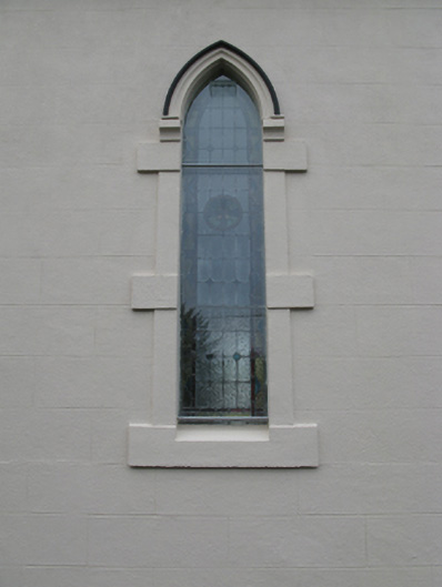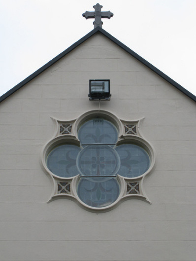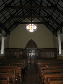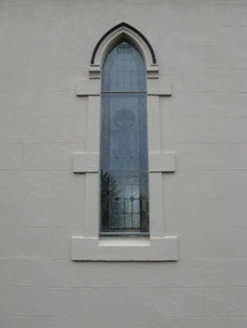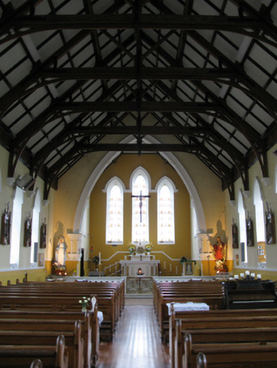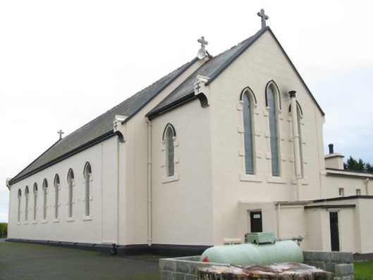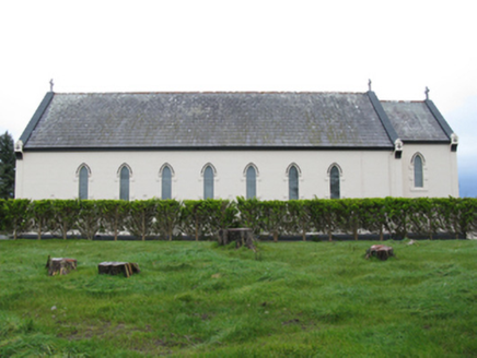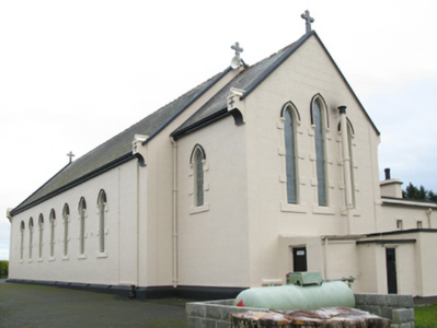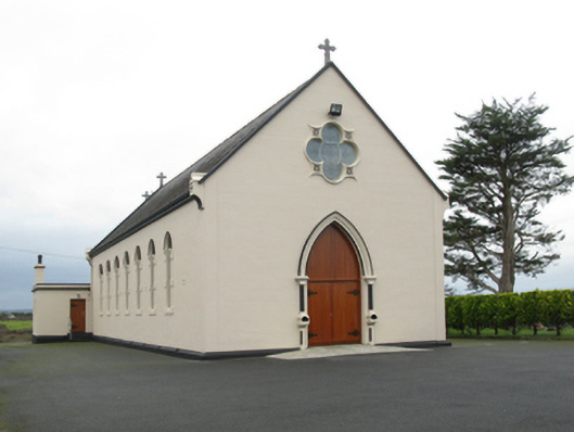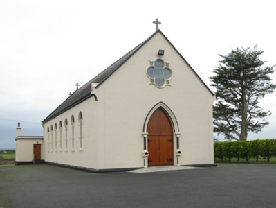 Detached eight-bay double-height Catholic church, completed 1939, comprising seven-bay double-height nave opening into single-bay double-height chancel (west). Pitched slate roofs with roll moulded terracotta ridge tiles, concrete coping to gables on cruciform-detailed roll moulded gabled "Cavetto" corbel kneelers with cut-limestone Cross finials to apexes, and cast-iron rainwater goods on timber eaves boards on rendered eaves retaining cast-iron ogee hoppers and square profile downpipes. Rendered, ruled and lined walls on rendered chamfered plinth with rendered "bas-relief" piers to corners. Lancet window openings with concrete sills, and rendered block-and-start surrounds with hood mouldings over on "Cavetto" label stops framing storm glazing over fixed-pane fittings having leaded stained glass margins centred on leaded stained glass roundels. Lancet "Trinity Window" to chancel (west) with concrete sills, and rendered block-and-start surrounds with hood mouldings over on "Cavetto" label stops framing storm glazing over fixed-pane fittings having leaded stained glass margins centred on leaded stained glass "lozenges". Pointed-arch door opening to entrance (east) front with poured concrete threshold, doorcase with colonettes on stoups supporting chevron- or saw tooth-detailed archivolt framing timber boarded or tongue-and-groove timber panelled double doors having overpanel. Quatrefoil "Rose Window" to gable with pebble encrusted moulded rendered surround framing storm glazing over fixed-pane fitting having stained glass margin centred on "Fleur-de-Lys"-detailed crucifix. Interior including vestibule (east); square-headed door opening into nave with glazed timber panelled double doors; full-height interior open into roof with stained glass "Rose Window" (east), central aisle between timber pews, Gothic-style timber stations between stained glass memorial windows (undated), exposed "dagger"-perforated split arch braced strutted collared timber roof construction on "Cavetto" corbels with wind braced ceiling in carved timber frame on carved timber cornice, and cut-veined white marble stepped dais to sanctuary (west) retaining arcaded communion railings with pointed-arch chancel arch framing stepped "predella" supporting Gothic-style altar below stained glass "Trinity Window". Set in own grounds with grounds relandscaped, 2010.