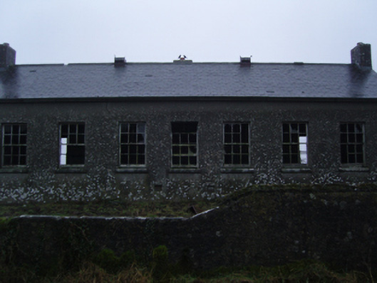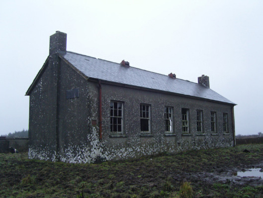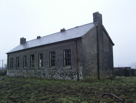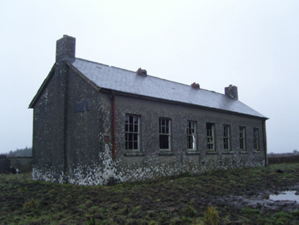 Detached five-bay single-storey national school, built 1935; opened 1935, on a T-shaped plan with single-bay single-storey lean-to projecting bays centred on single-bay full-height gabled projecting porch; seven-bay single-storey rear (east) elevation. Closed, 1968. Now disused. Pitched slate roof on a T-shaped plan extending into lean-to slate roofs centred on pitched (gabled) slate roof with clay ridge tiles terminating in red brick Running bond chimney stacks centred on red brick Running bond chimney stack having lichen-covered chamfered capping supporting terracotta pots, and cast-iron rainwater goods on timber eaves boards on box eaves retaining cast-iron downpipes. Rendered walls. Square-headed window openings centred on paired square-headed window openings with square-headed window openings to rear (east) elevation, cut-limestone sills, and concealed dressings framing remains of six-over-six timber sash windows centred on four-over-four timber sash windows with six-over-six timber sash windows to rear (east) elevation. Square-headed opposing door openings with concealed dressings framing timber boarded or tongue-and-groove timber panelled doors. Set in unkempt grounds with rear (east) elevation fronting on to road.
