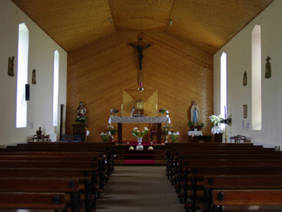 Detached four-bay double-height single-cell Catholic church, designed 1861; built 1862; dated 1862; extant 1911, with single-bay single-storey gabled projecting porch to entrance (west) front. Renovated, 1936-7, with interior "improved". Renovated, 1964-5, with sanctuary reordered. Renovated, 1988. Pitched slate roofs including pitched (gabled) slate roof to porch with clay ridge tiles, concrete coping to gables with Cross finial to apex (west), and replacement uPVC rainwater goods on cement rendered eaves. Replacement cement rendered walls bellcast over rendered plinth with rendered "bas-relief" piers to corners. Lancet window openings with concrete sills[?], and moulded rendered surrounds framing storm glazing over fixed-pane fittings having stained glass margins centred on lattice glazing bars. Segmental-headed opposing door openings to porch with concrete step thresholds, and concealed dressings framing timber boarded or tongue-and-groove timber panelled double doors. Interior including vestibule (west) with wall monument (ob. 1864); square-headed door opening into nave with glazed timber panelled double doors; full-height interior with carpeted central aisle between timber pews, stained glass memorial windows (????; 1953), and herring bone-pattern timber parquet stepped dais to sanctuary (east) reordered, 1964-5, with stepped "predella" supporting replacement altar table. Set in landscaped grounds shared with Saint Brigid's Abbey (founded 1224; rebuilt 1460).