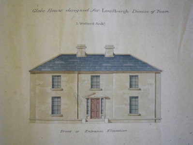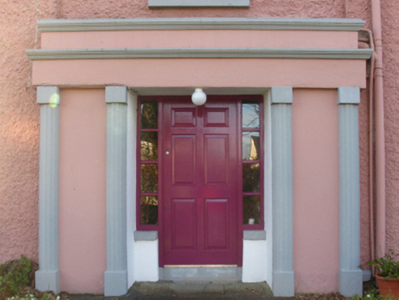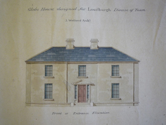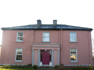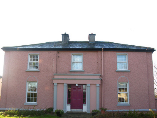 Detached three-bay two-storey Board of First Fruits Church of Ireland glebe house, designed 1824; built 1826 or 1828, on an L-shaped plan with two-bay (east) or single-bay (west) two-storey side elevations. Occupied, 1901; 1911. Vacant, 1944. Renovated, ----. Hipped slate roof on an L-shaped plan with clay ridge tiles, paired cement rendered central chimney stacks having concrete capping supporting terracotta pots, and replacement uPVC rainwater goods on timber eaves boards on rendered cut-limestone eaves retaining cast-iron downpipes. Roughcast walls on cut-limestone chamfered cushion course on roughcast plinth. Hipped square-headed central door opening with timber mullions on step threshold framing replacement timber panelled door having sidelights. Square-headed window openings with cut-limestone sills, and concealed dressings framing replacement uPVC casement windows replacing six-over-six timber sash windows. Interior including (ground floor): central hall retaining carved timber surrounds to door openings framing timber panelled doors; and carved timber surrounds to door openings to remainder framing timber panelled doors with carved timber surrounds to window openings framing timber panelled reveals or shutters. Set in landscaped grounds with rendered piers to perimeter having pebble encrusted capping supporting spear head-detailed cast-iron double gates.