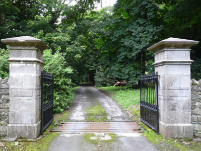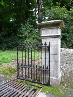 Gateway, extant 1897, on a symmetrical plan comprising pair of drag edged dragged-panelled drag edged tooled limestone ashlar piers on chamfered plinths having chamfered stringcourses below "Cavetto"-detailed pyramidal capping supporting cast-iron double gates. Road fronted at entrance to grounds of Saint Helen's.