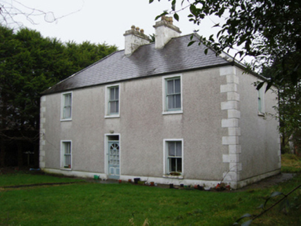 Detached three-bay two-storey presbytery, extant 1897, on a T-shaped plan originally three-bay single-storey with single-bay (single-bay deep) full-height central return (west). "Improved", pre-1911, producing present composition. Now disused. Hipped slate roof on a T-shaped plan with clay ridge tiles, paired rendered central chimney stacks having stringcourses below capping supporting terracotta or yellow terracotta tapered pots, and replacement uPVC rainwater goods on rendered eaves. Gritdashed roughcast walls bellcast over rendered plinth with rusticated rendered quoins to corners. Square-headed central door opening with rendered surround framing replacement glazed timber panelled door having overlight. Square-headed window openings with concrete sills, and rendered surrounds framing two-over-two timber sash windows. Interior including (ground floor): central hall retaining timber surrounds to door openings framing timber panelled doors; and timber surrounds to door openings to remainder framing timber panelled doors with timber panelled shutters to window openings. Set in landscaped grounds with piers to perimeter supporting wrought iron gate.