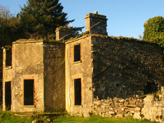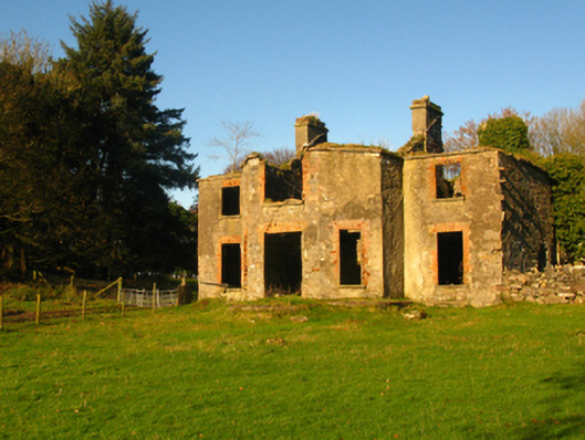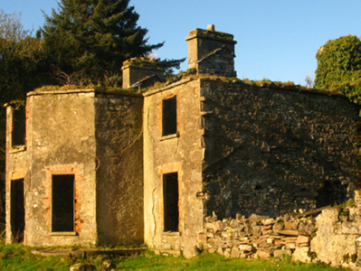 Detached three-bay two-storey sporting lodge, extant 1838, on an L-shaped plan centred on single-bay full-height breakfront on a half-octagonal plan; single-bay (west) or two-bay (east) two-storey side elevations. Occupied, 1911. Now in ruins. Roof now missing with paired rendered, ruled and lined central chimney stacks having lichen-covered cut-limestone stringcourses below capping supporting abbreviated terracotta or yellow terracotta octagonal pots, and no rainwater goods surviving on cut-limestone eaves retaining some cast-iron downpipes. Part overgrown fine roughcast coursed rubble limestone walls with concealed cut-limestone or sandstone flush quoins to corners. Square-headed central door opening with overgrown dragged cut-limestone step, and red brick voussoirs with no fittings surviving. Square-headed window openings with drag edged dragged cut-limestone sills, and red brick block-and-start surrounds with no fittings surviving. Interior in ruins. Set in unkempt grounds.