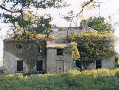 Detached three-bay two-storey farmhouse, extant 1838, on a T-shaped plan centred on single-bay two-storey lean-to projecting breakfront. Occupied, 1901. Vacant, 1911. Now disused. Hipped slate roof on a T-shaped plan centred on lean-to slate roof with clay or terracotta ridge tiles, rendered chimney stacks having corbelled stepped stringcourses below capping, and no rainwater goods surviving on roughcast cut-limestone eaves retaining cast-iron downpipes. Part creeper- or ivy-covered roughcast battered walls. Square-headed central door opening with concealed dressings framing remains of timber boarded or tongue-and-groove timber panelled door. Square-headed window openings to "cheeks" with lichen-spotted cut-limestone sills, and concealed dressings framing remains of timber fittings. Square-headed window openings with lichen-spotted cut-limestone sills, and concealed dressings framing remains of one-over-one timber sash windows. Interior including (ground floor): central hall retaining timber surrounds to door openings framing timber panelled doors; and timber surrounds to some door openings to remainder framing timber panelled doors with timber surrounds to some window openings framing timber panelled reveals or shutters. Set in unkempt grounds with limestone ashlar piers to perimeter having lichen-covered capping supporting flat iron "farm gate".